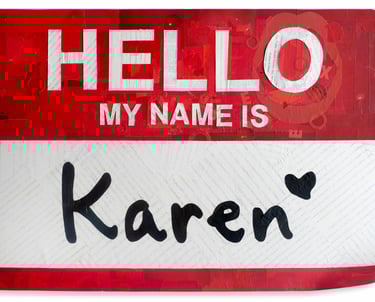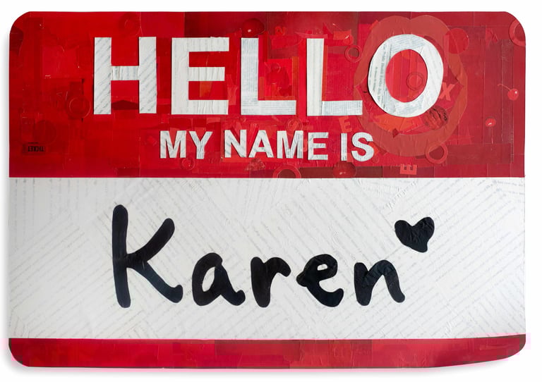 When mask wearing was mandatory in the pandemic, the everyday citizens who were voluntarily enforcing the government mask mandate were coined as a "Karen". Social media was rife with posts including the phrase "Don't be such a Karen". This giant name tag mirrors the self aggrandizement of these self-appointed guardians of that culture.