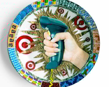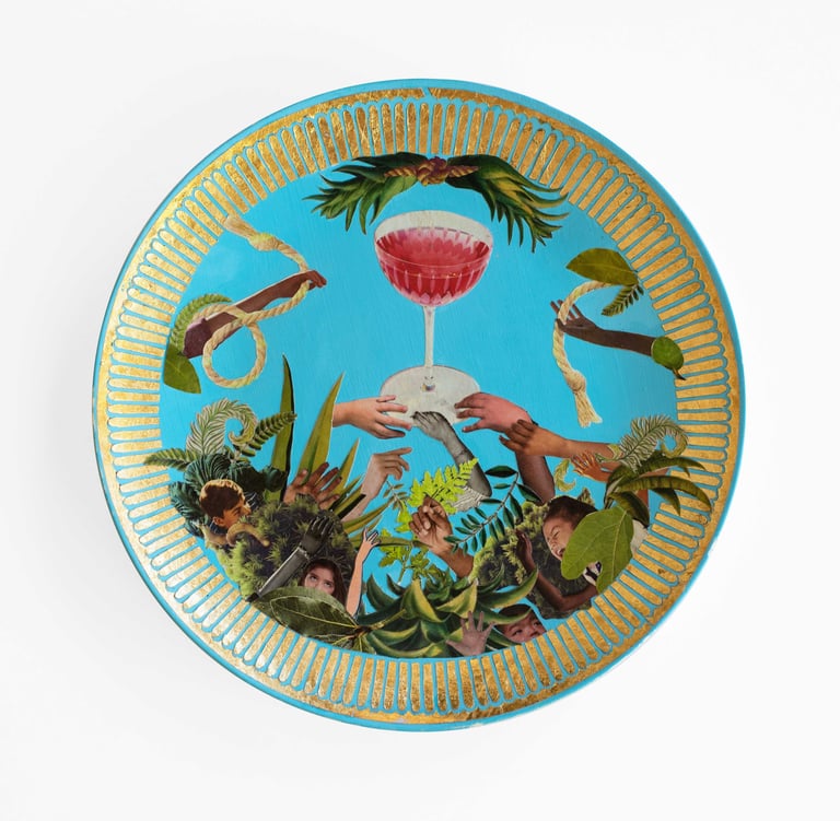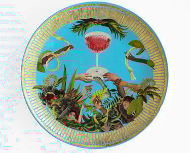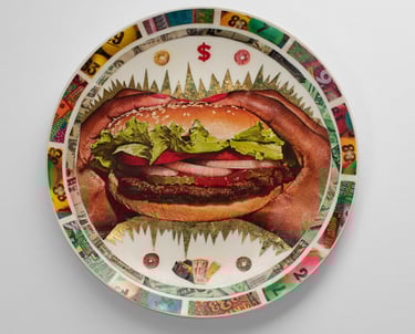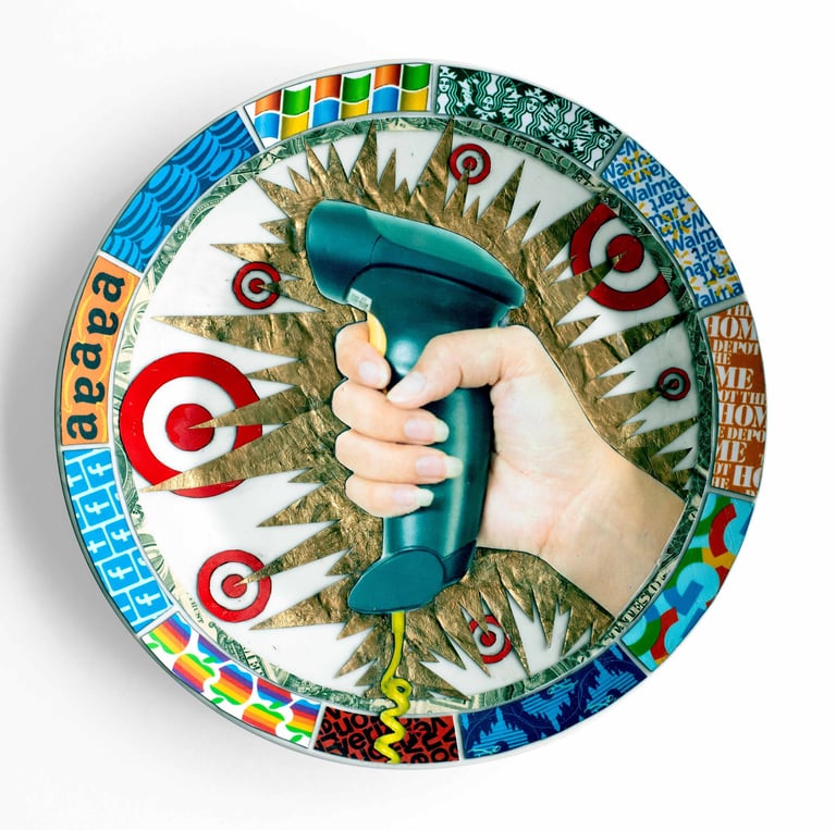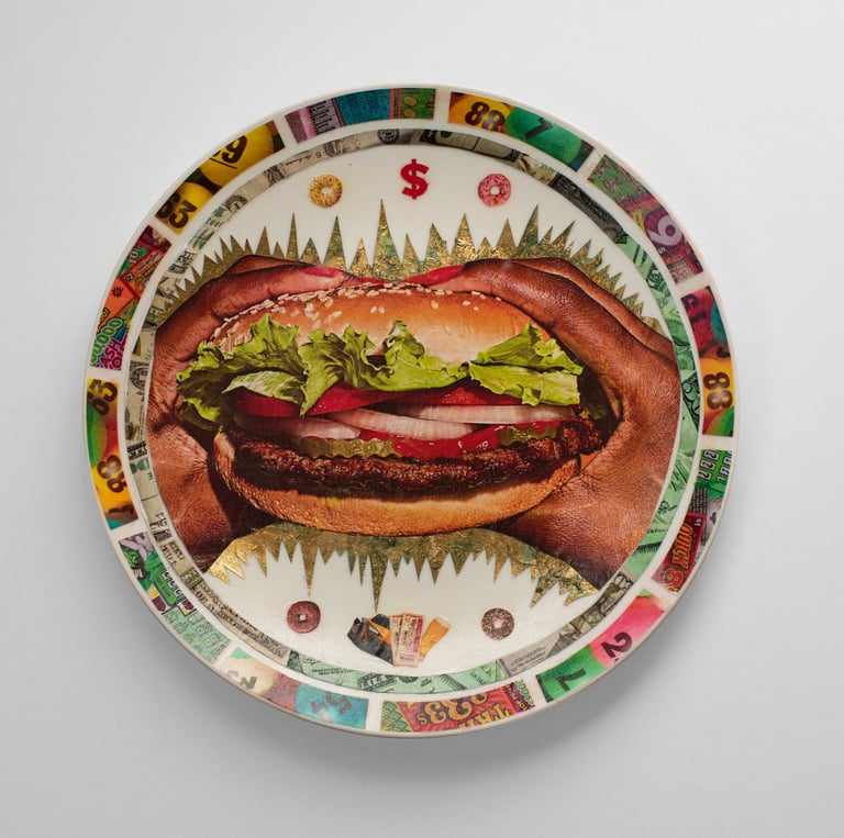 Though the pandemic period was rife with hardships, one benefit was a byproduct of staying at home and receiving government money: many people didn't have to work. This collage plate remembers with the time in recent history when many of our top corporations had employee shortages because of the awakening to deeper desires combined with more free money than people could ever make at an hourly job.