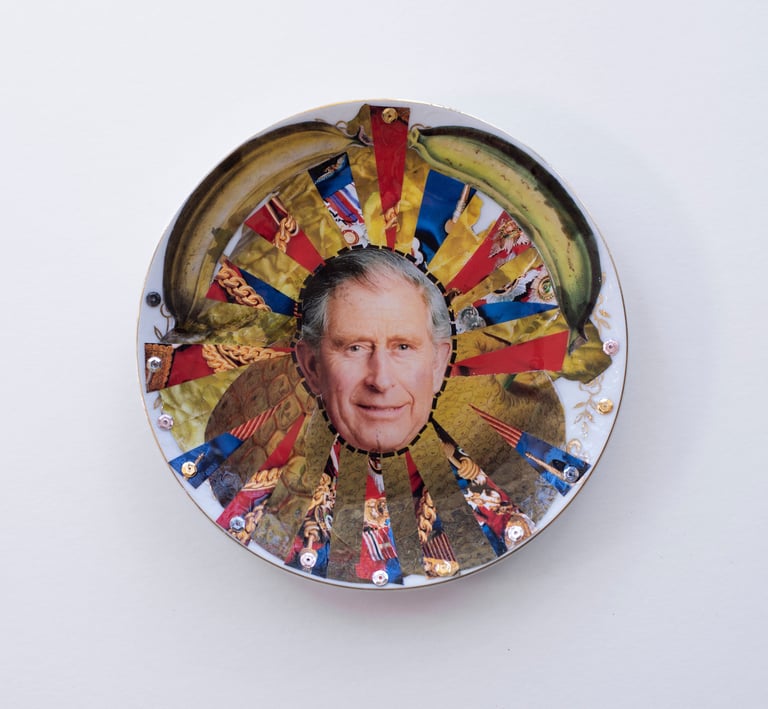 This plate speaks about the rumors that have surfaced connecting members of the royal family to illegal underage sex activities. The dotted line around the head implies the ability to cut out his head and replace it with another.