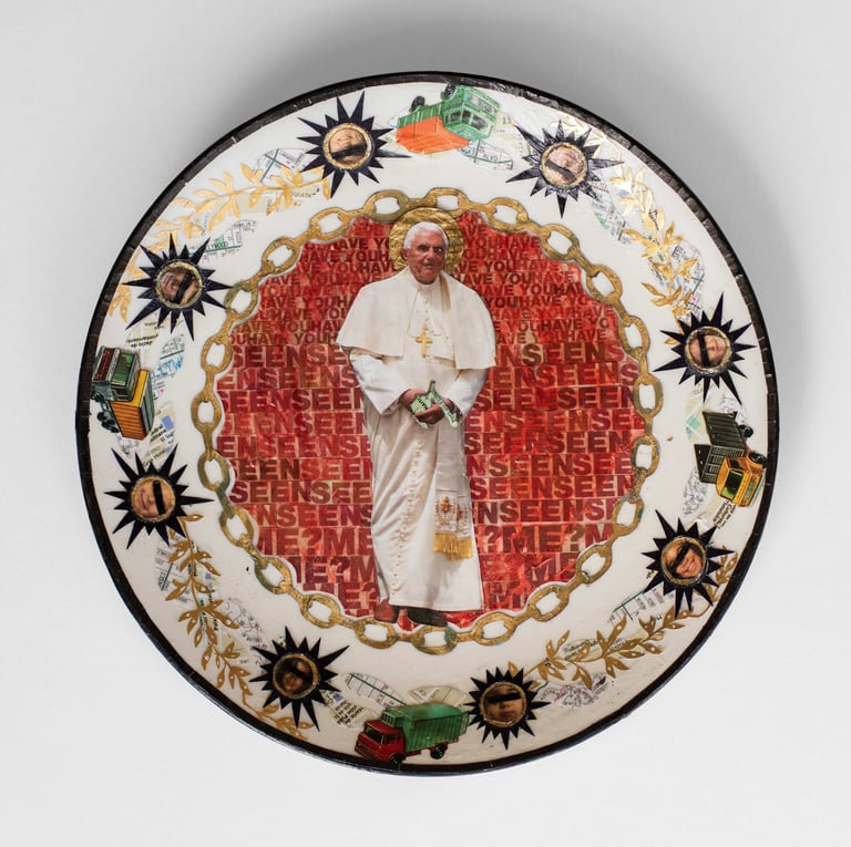 "Black Market Babes" talks about the conspiracy theories surrounding the involvement in religious organizations in the massive underground child sex trafficking circuit. The pope is featured as the central symbol, backed by words from ads from a child protection agency. A golden chain is then encircled with missing children and transportation trucks. In his hands is the country of Haiti, a central zone rumored to be high in recent sex trafficking activity.
